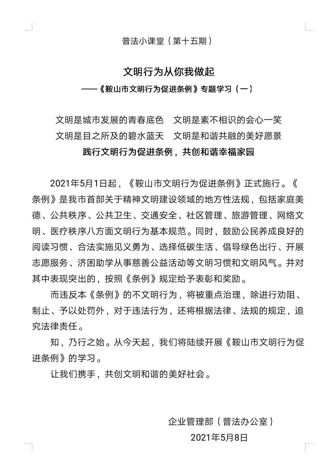 樹(shù)立文明風(fēng)尚,提升服務(wù)素質(zhì)交運(yùn)集團(tuán)全面推進(jìn)落實(shí)《鞍山市文明行為促進(jìn)條例》 《鞍山市文明行為促進(jìn)條例》是我市首部關(guān)于精神文明建設(shè)領(lǐng)域的地方性法規(guī),是我市精神文明建設(shè)的重要抓手,2021年5月1日起正式實(shí)施。為培育和踐行社會(huì)主義核心價(jià)值觀,引導(dǎo)和促進(jìn)文